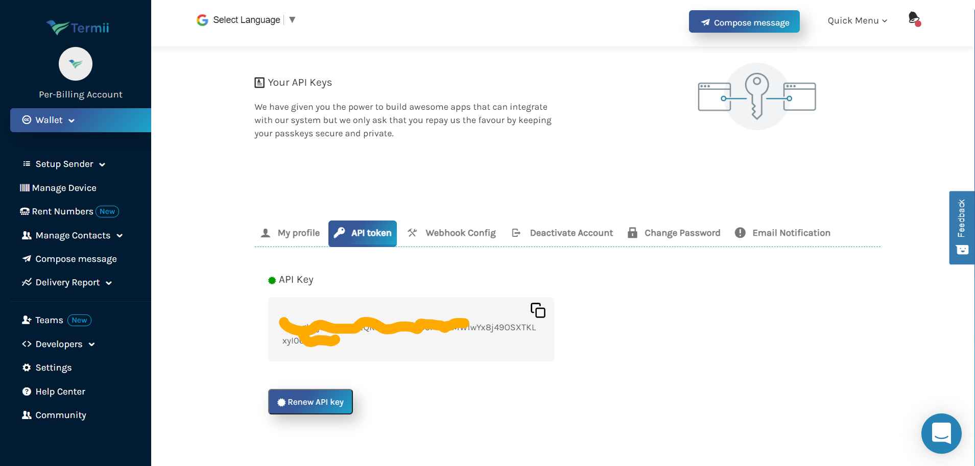 The Termii API uses API keys to authenticate requests. You can view and manage your API keys in the Termii Dashboard. API calls are authenticated by including your API key in the body of the request you make. If you do not include your API key when making an API request or use a valid API key, Termii returns a http error.